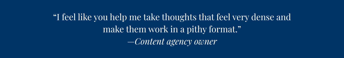 I’ve ghostwritten for CEOs, founders, business development execs, creatives, and solopreneurs. Get the full scoop, including recommendations and credentials, from my LinkedIn.